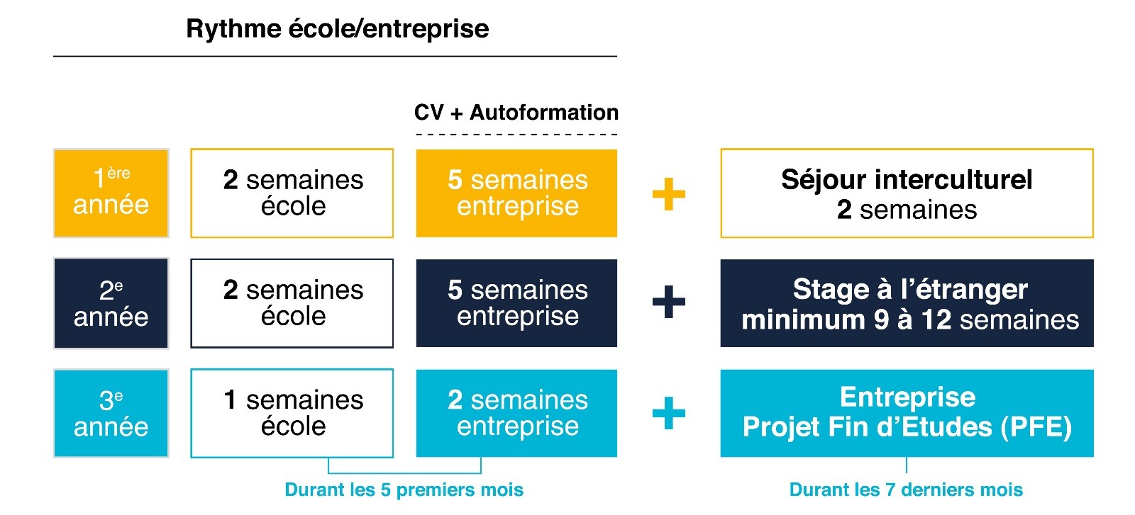 Le rythme d’alternance est globalement de 2 semaines en école suivies de 5 semaines en entreprise. L a dernière année se conclut par un semestre en entreprise pour le projet de fin d’étude.
