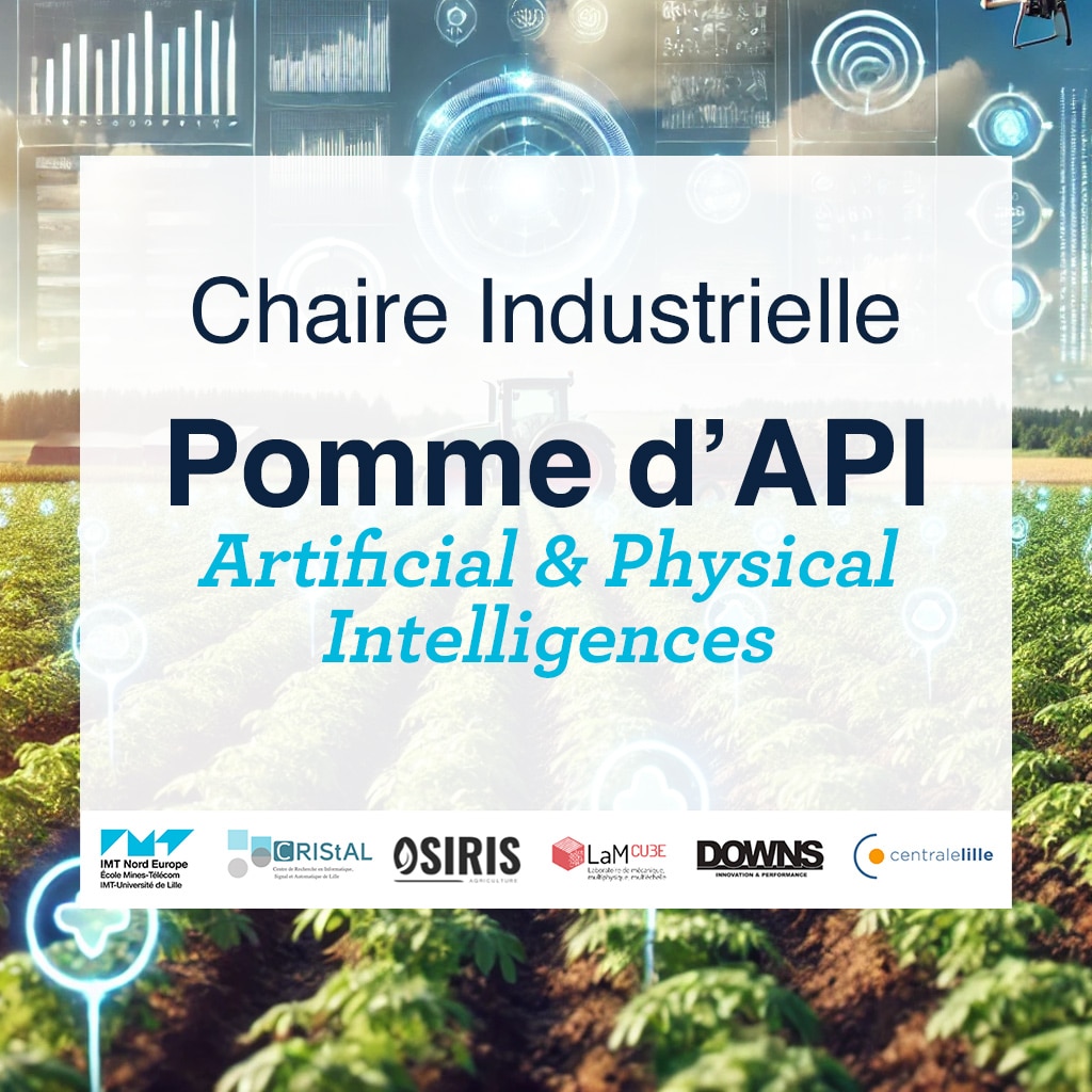 IMT Nord Europe a lancé, fin 2024 / début 2025, la chaire industrielle « Pomme d’API – Artificial & Physical Intelligences », co-porté avec Centrale Lille et en partenariat avec des laboratoires académiques (CERIStAL, LaMcube) et deux industriels (Osisris et Downs). Cette chaire vise à développer des outils d’intelligence pour la prise de décision en agriculture, en standardisant les processus de catégorisation des produits et en promouvant une meilleure traçabilité. L’objectif est de diminuer les coûts opérationnels, d’accroître la transparence au sein de la filière, d’aider les agriculteurs dans leur connaissance de leur produit, et de soutenir des méthodes de culture plus durables. Le projet ambitionne également de renforcer la souveraineté alimentaire en améliorant les rendements, au travers de solutions intelligentes physiquement fondées depuis la culture jusqu’à la récolte.
