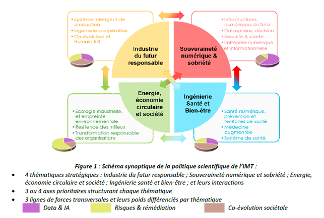 Au coeur des champs très larges des 3 transitions, industrielle, numérique et écologique, et de leurs interactions, la stratégie de l’Institut Mines-Télécom se focalise autour de 4 thématiques qui vont polariser la mobilisation collective et l’évolution des compétences des équipes : (i) Industrie du futur responsable, (ii) Souveraineté numérique et sobriété, (iii) Energie, économie circulaire et société, et (iv) Ingénierie santé et bien-être.